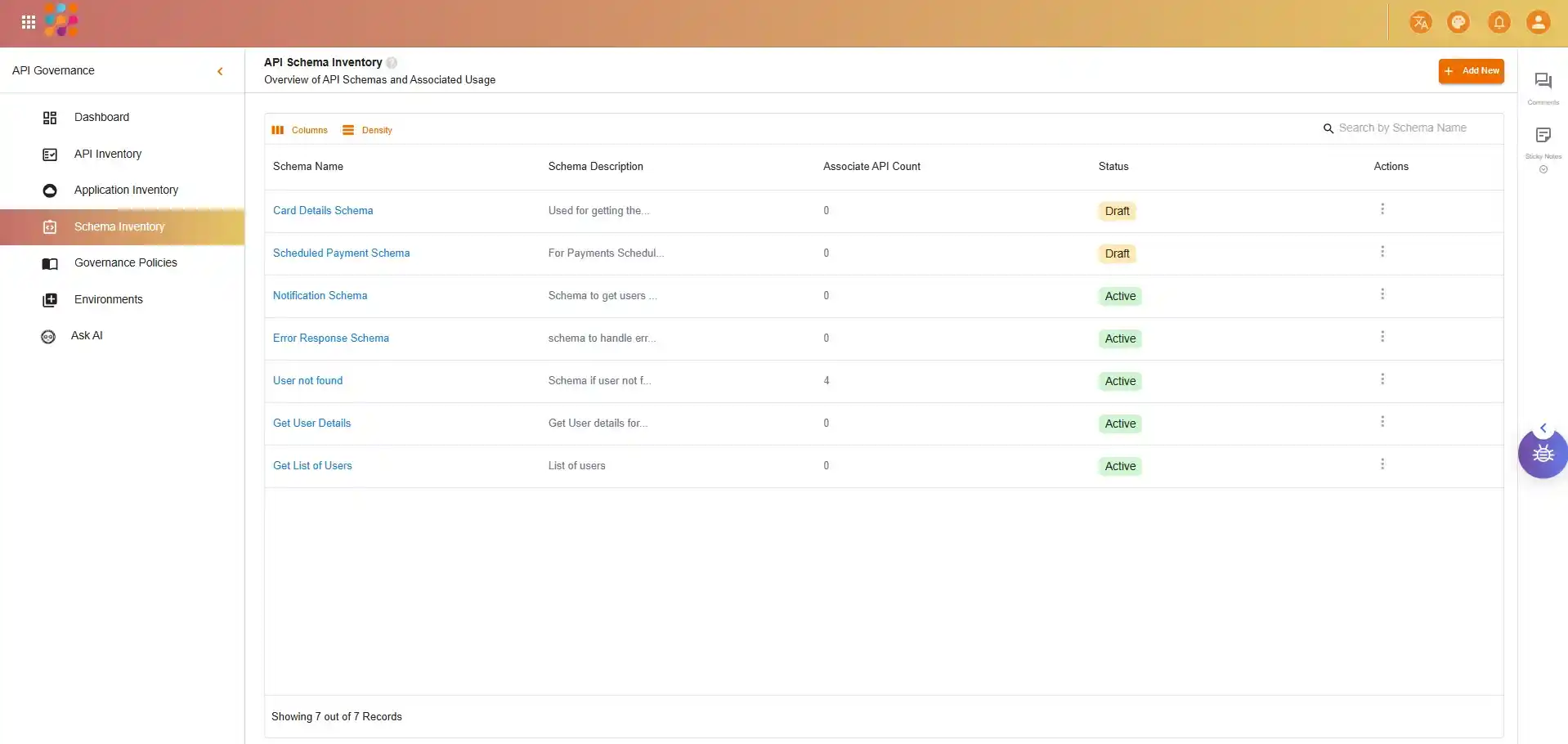 See all APIs across your organization in one place, differentiated by API status, version, ownership, and schema details.