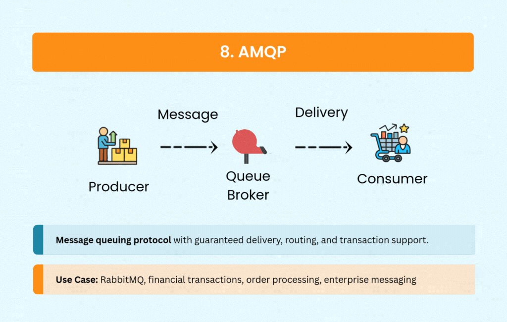 AMQP brings structure and reliability to enterprise messaging. Unlike simple message passing, AMQP provides message queuing with persistence, flexible routing options, and transaction support.