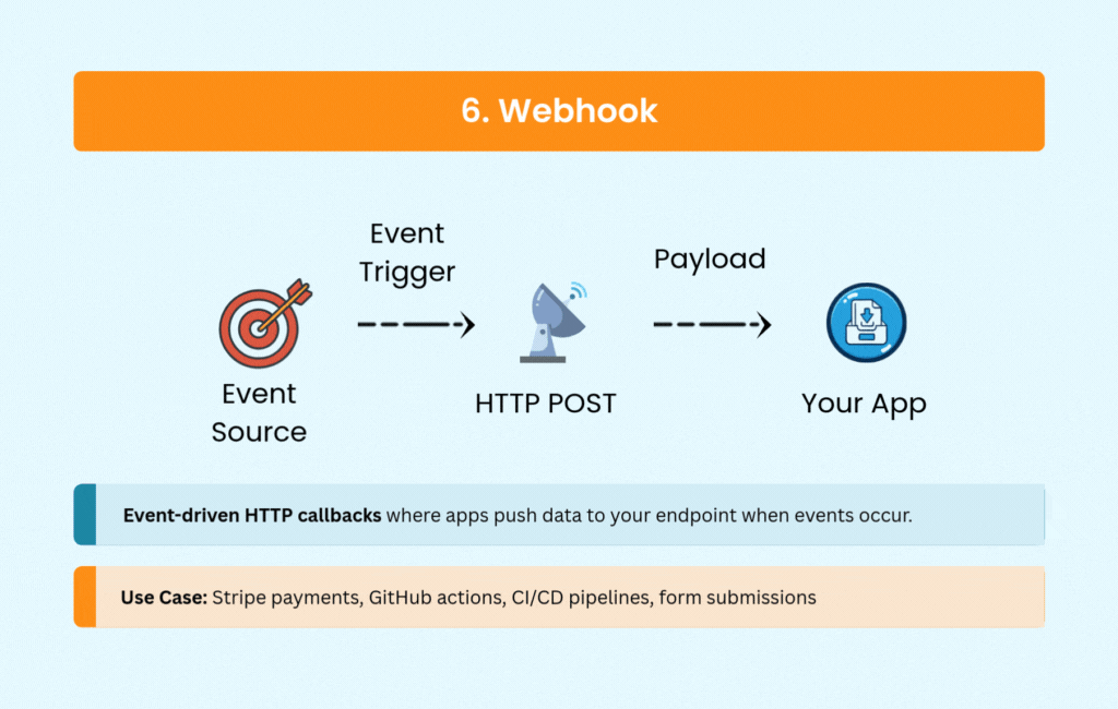 Payment processors like Stripe and PayPal use webhooks to confirm transactions. CI/CD platforms like GitHub and GitLab trigger pipelines through webhooks. E-commerce platforms send order notifications, and CRM systems sync data—all without polling overhead.