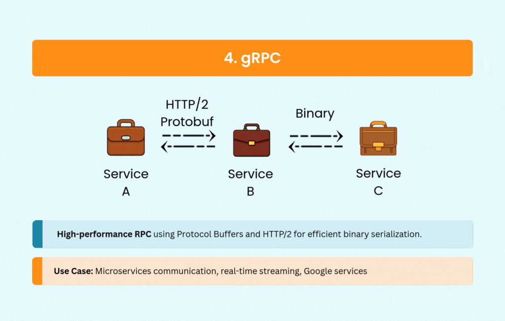 gRPC shines in microservices architectures and real-time applications where performance matters. Mobile backends benefit from its efficiency, reducing battery drain. The binary format isn’t human-readable, and browser support remains limited, making gRPC better suited for internal communication than public APIs.